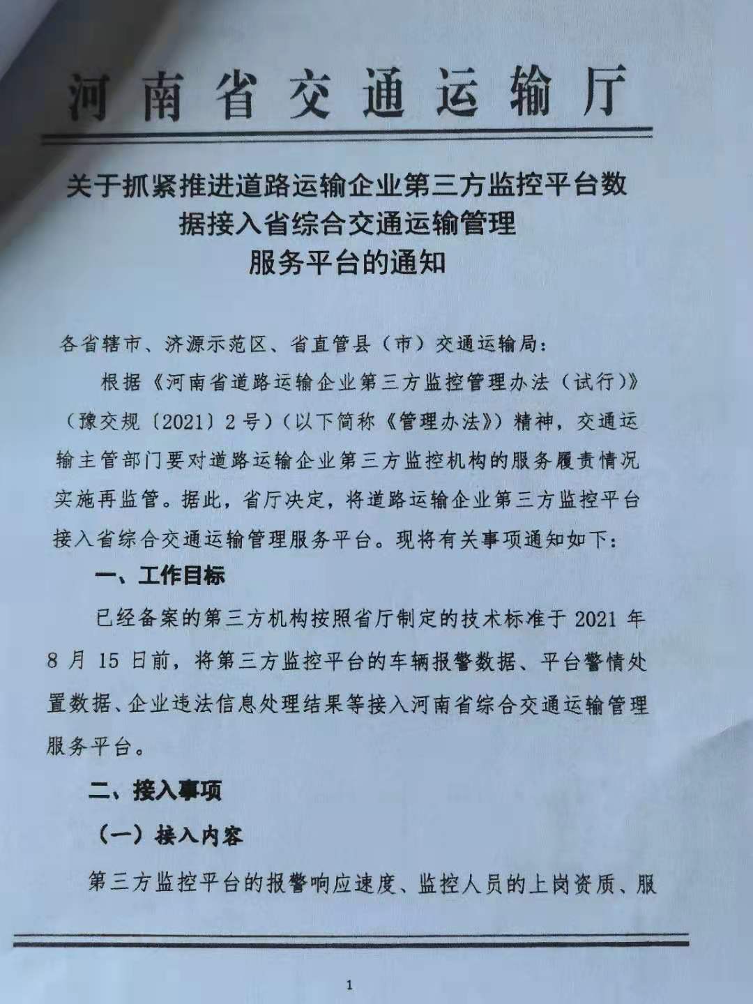 河 南 省 交 通 運(yùn) 輸 廳 關(guān)于抓緊推進(jìn)道路運(yùn)輸企業(yè)第三方監(jiān)控平臺數(shù) 據(jù)接入省綜合交通運(yùn)輸管理 服務(wù)平臺的通知