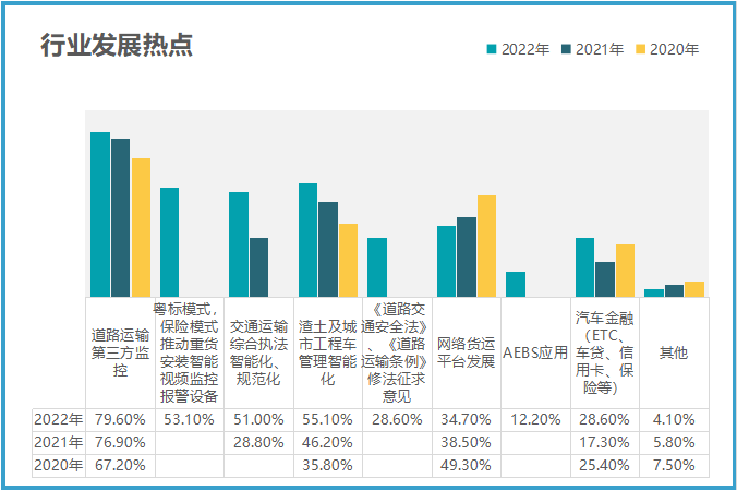 2021年,在行業(yè)發(fā)展熱點(diǎn)的關(guān)注度中,道路運(yùn)輸?shù)谌奖O(jiān)控遙遙領(lǐng)先,穩(wěn)居第一位,不過也不意外,從近三年的數(shù)據(jù)來看,道路運(yùn)輸?shù)谌奖O(jiān)控一直備受關(guān)注;從公開新聞和招投標(biāo)情況來看,第三方安全監(jiān)控平臺(tái)出現(xiàn)頻率也在增高。但就目前來說,第三方安全監(jiān)控平臺(tái)的發(fā)展雖有蓬勃之勢,但總體還是處在無序化發(fā)展的狀態(tài),不少平臺(tái)還是換湯不換藥,提供的服務(wù)還停留在表面,還是通過政府管理或者規(guī)模優(yōu)勢來獲得市場、利潤??偟膩碚f,第三方安全監(jiān)控平臺(tái)商業(yè)模式的多樣化也需要時(shí)間來培育。