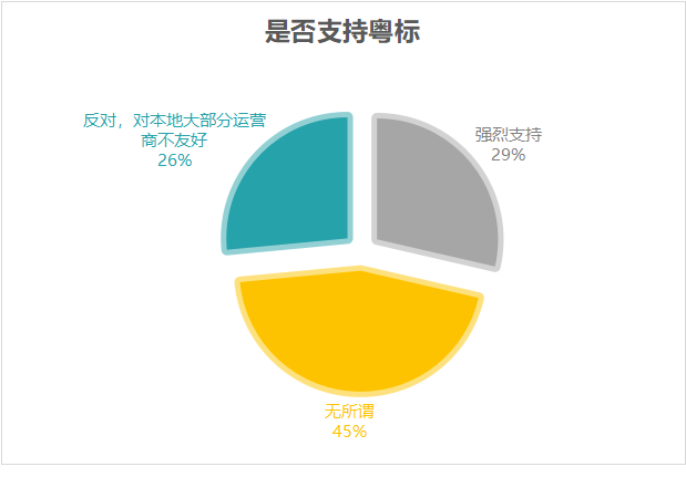 調(diào)查結(jié)果顯示,29%的運(yùn)營商強(qiáng)烈支持粵標(biāo)模式,不過支持與反對(duì)的聲音幾乎持平,有26%的運(yùn)營商反對(duì)“粵標(biāo)”模式,認(rèn)為其對(duì)本地大部分運(yùn)營商不友好,剩下的45%則表示無所謂,應(yīng)是持觀望態(tài)度,反正火還沒燒到自家。