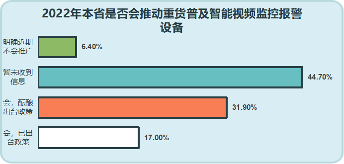 2021年廣東完成了30萬臺(tái)重貨安裝主動(dòng)安全報(bào)警設(shè)備的工作,2022年其他省市是否會(huì)跟進(jìn)安裝工作是現(xiàn)階段設(shè)備市場關(guān)注的重點(diǎn)。根據(jù)調(diào)查結(jié)果,只有少數(shù)運(yùn)營商表示近期本省不會(huì)有推動(dòng)動(dòng)作,但,幾乎可以肯定重貨普及智能視頻監(jiān)控報(bào)警設(shè)備勢在必行,只是時(shí)間問題。目前,福建、河北、南寧等省市已經(jīng)開展了相關(guān)試點(diǎn)工作。